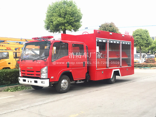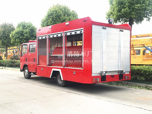 這款車型采用五十鈴700P底盤打造而成、五十鈴150馬力發動機,車輛尾部配備版遙控液壓尾門操作,方便快速的操控機器人上下車,車身兩旁配備了消防水帶固定架,方便存儲更多的水帶、前部設定了各種消防器材或者手抬消防泵器材室。